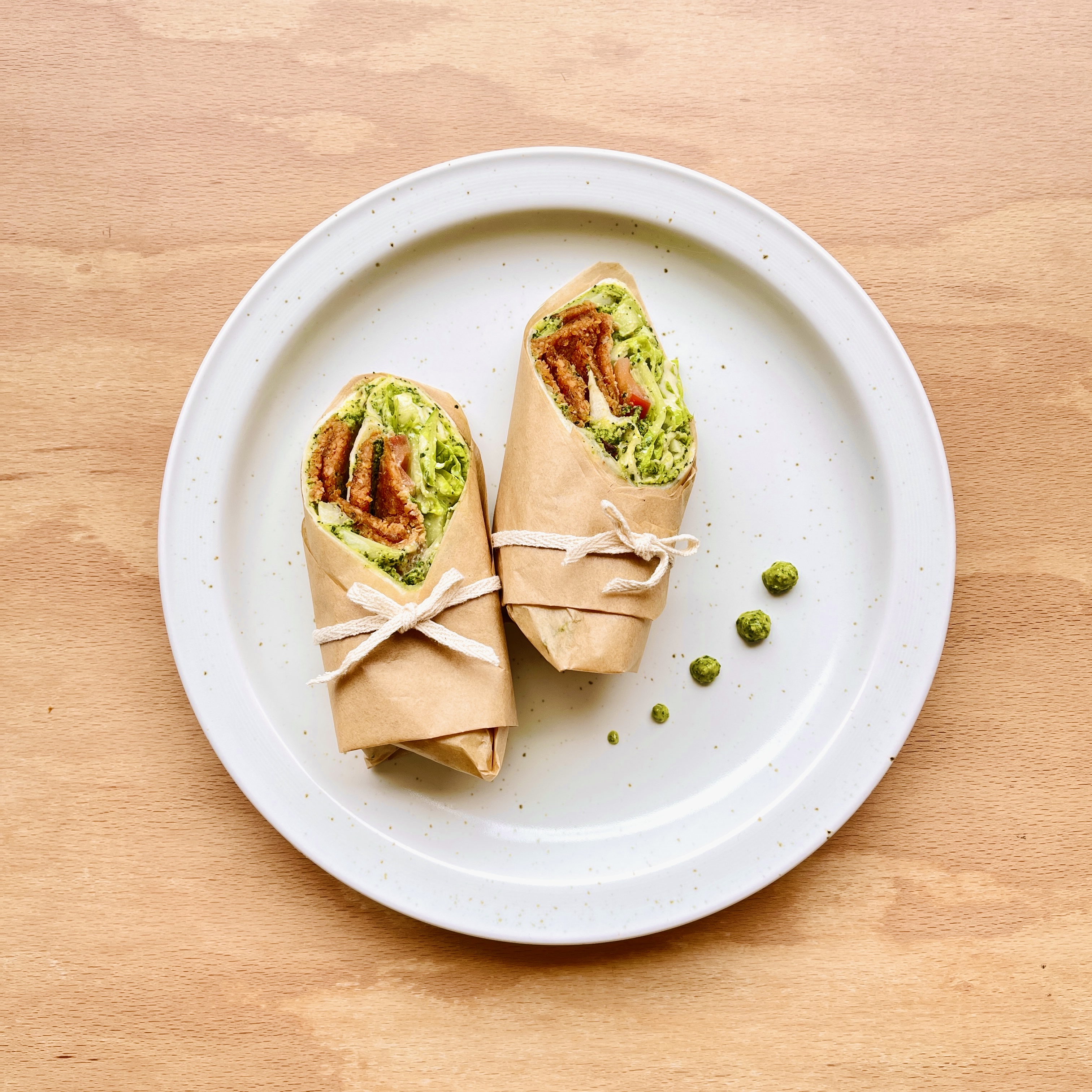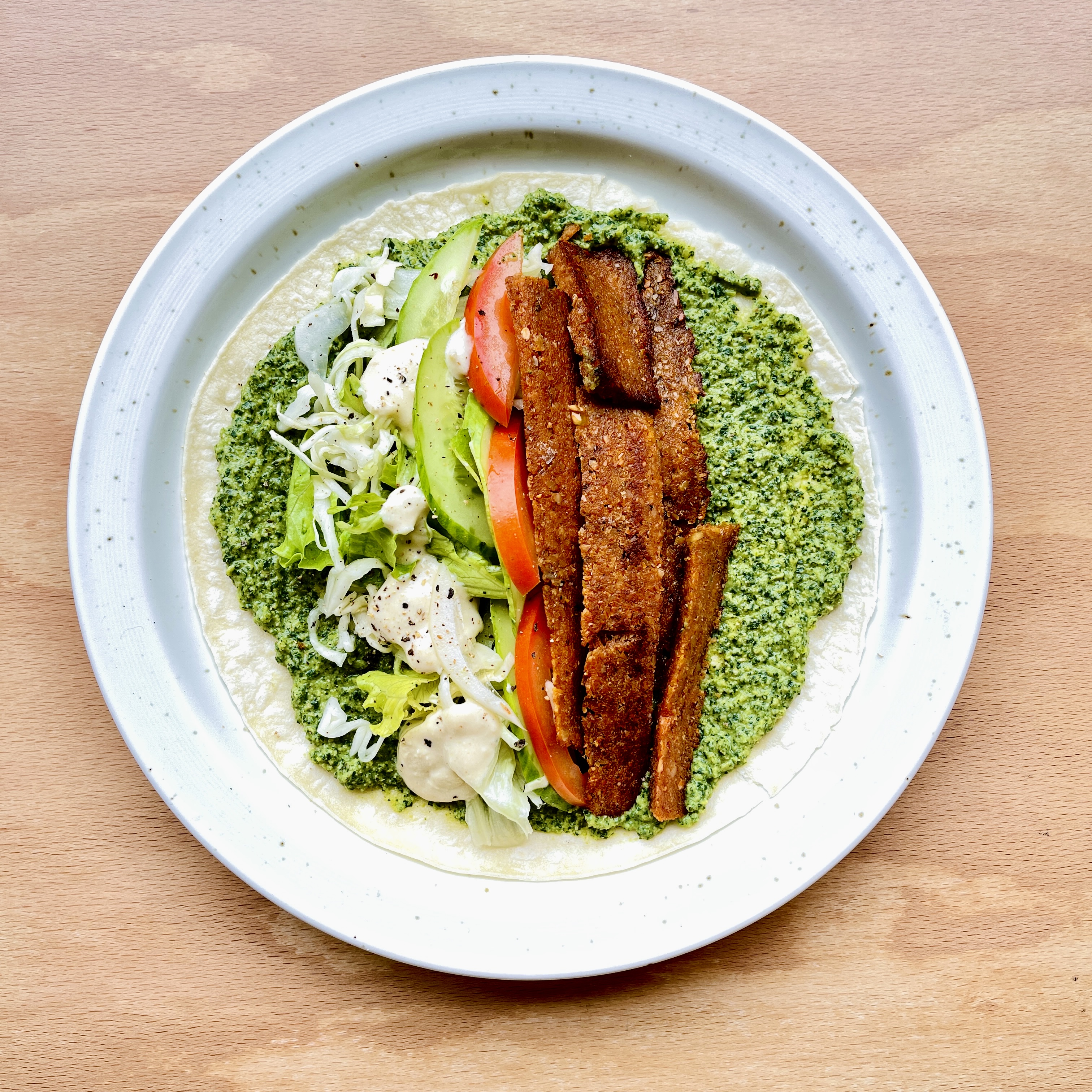 1) 우리밀 또띠아에 그린 후머스를 바른다.